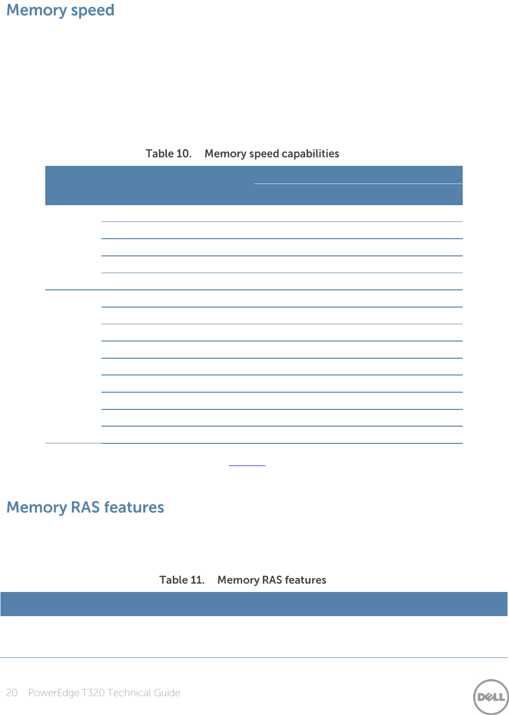 Table 10 lists memory configuration and performance details for the T320 based on the population